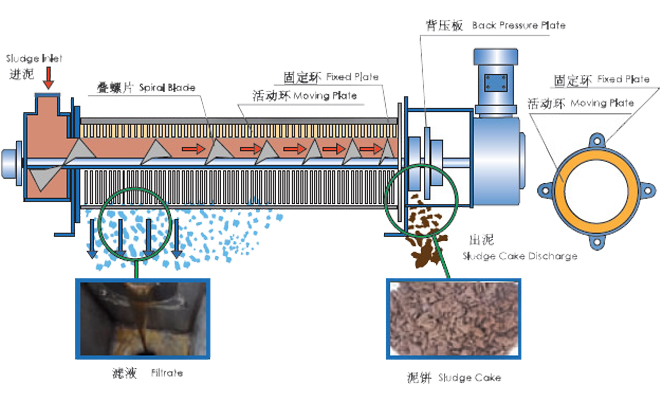 設備運行時,污泥從進料口進入濾筒后受到螺旋葉片的推送向卸料口移動,由于螺旋軸葉的螺距逐漸縮小,因此污泥所受到的壓力也隨之不斷增加,并在壓力的作用下開始脫水,水從固定環(huán)與游動環(huán)的間隙流出,同時設備依靠固定環(huán)也游動環(huán)之間的自清洗功能,清掃過濾間隙不易堵塞,泥餅經(jīng)過脫水后在螺旋軸的推進作用下從卸料口排出。