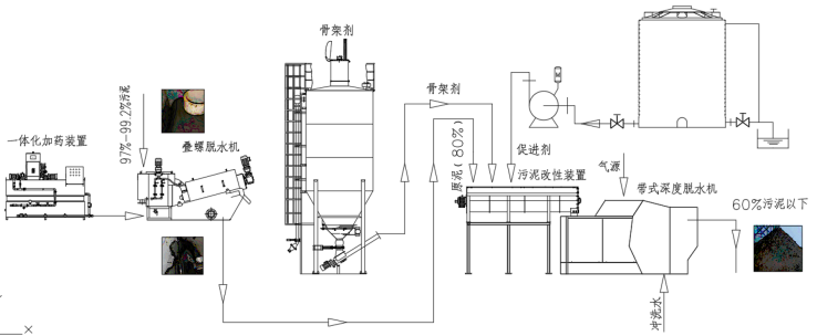 1、經(jīng)過疊螺式污泥脫水機初級脫水,將含水率99%的污泥降至含水率75%-85%。